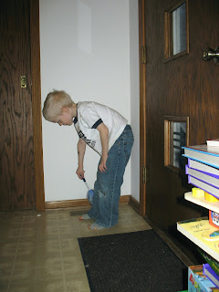 Finally Ram assisted Lamb 3 so he did a little cleaning.We just cleaned the entryway on Friday. It was quite dirty- still mud from our construction this fall (even though I had vacuumed there, I think we'll be dealing with mud for a long time) and where puddles were from the Lambs and Ram after they shoveled the front walk several times. It was just a small project on Friday to get us started on the bigger cleaning jobs like the living room. Hopefully we'll be finished cleaning by the time of the party!